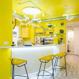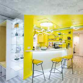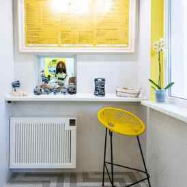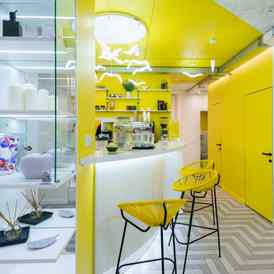 Интерьер Yellow Bar в Минске оформлен в солнечно желтых и белых цветах, что с первых минут вызывает радость и тепло. Подсвеченный логотип и разноуровневые светильники добавляют выразительности пространству, а высокие табуреты на тонких ножках, приносят ассоциации со стройностью и легкостью. Одна из стен имеет косметическую зону, где гости, совершив заказ, в перерыве между занятиями, могут выбрать для себя уходовые средства. Также есть безопасная мягкая ниша с качелями для детей.